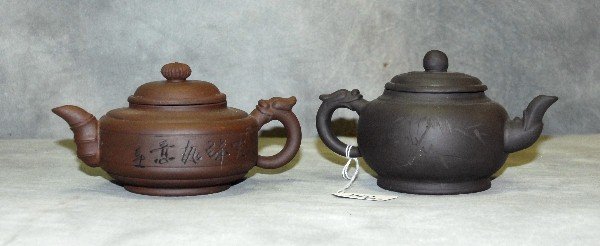 2 Chinese ceramic teapots with chop marks on bottom.
