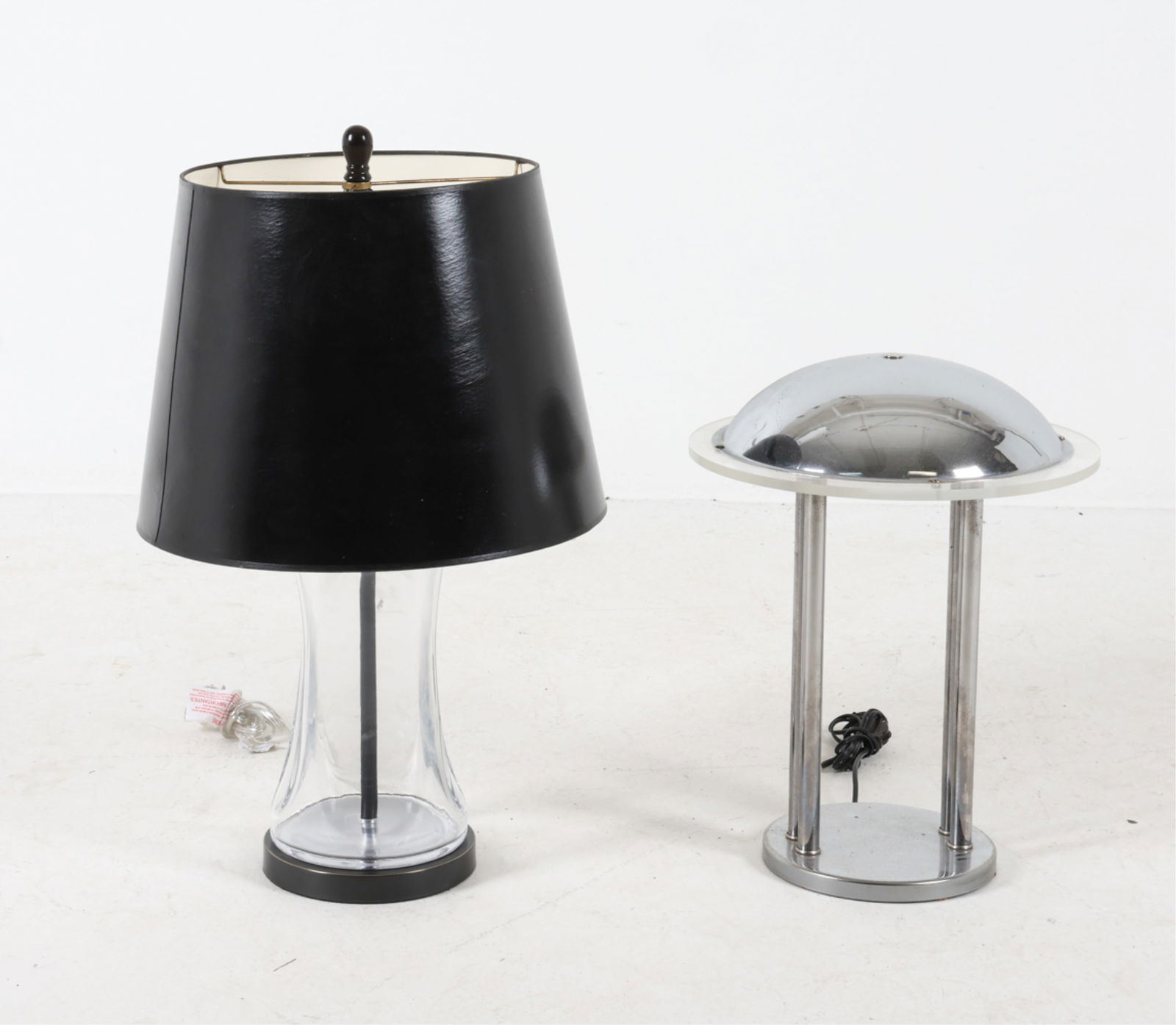 Sold(2) HOLTKOETTER LEUCHTEN TABLE LAMPS(2) Holtkotter Leuchten Contemporary table lamps. Marked underneath, one with glass shade and glass sleeve and one without. Dimensions: H 19" x Dia 7" Condition: Couple handling marks.See Sold Price