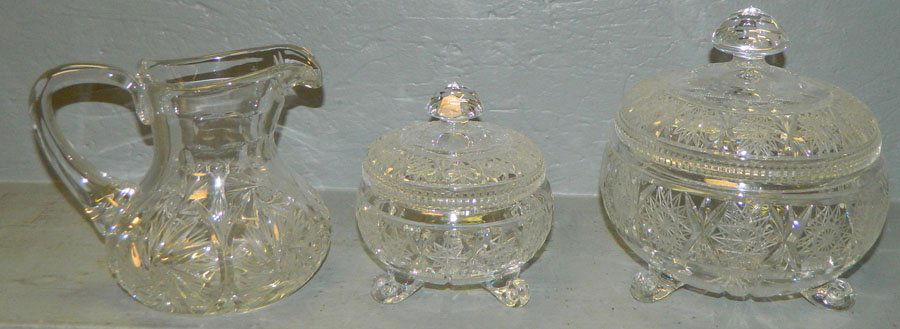 (2) Covered cut footed dishes, small cut pitcher
