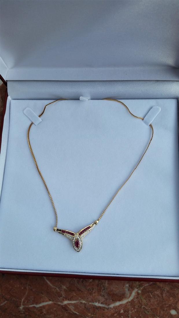 SoldNice 10KT Ruby and Diamond NecklaceBeautiful 10 kt yellow gold 2 CT ruby, 1.8 CT diamonds, 17 inches long necklace, 2.5 dwt, 3.9 grams. Value: $680See Sold Price