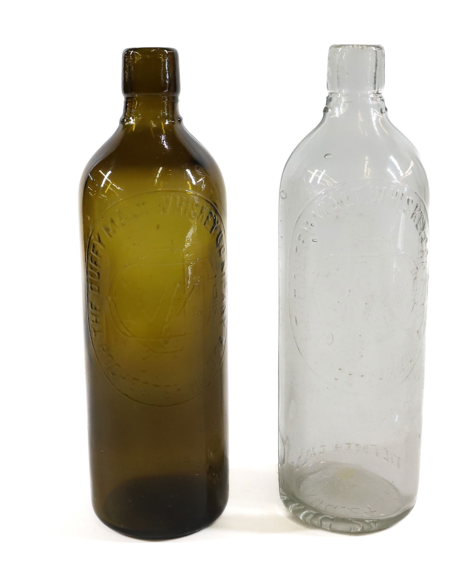 Sold(2) DUFFY MALT WHISKEY BOTTLESONE OLIVE GREEN AND ONE CLEAR. 10". PLEASE READ CAREFULLY - Terms for Purchasing and Shipping of Auction Items. Please read carefully before bidding. All payments for purchases will be made through LiSee Sold Price