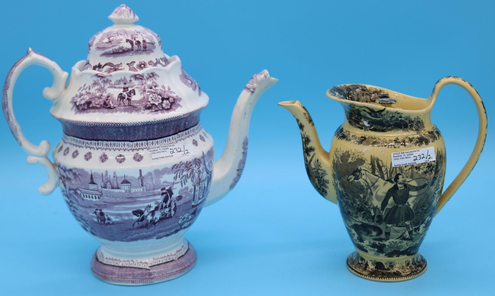 2 EARLY 19TH C. TRANSFER WARE TEAPOTS, PURPLE