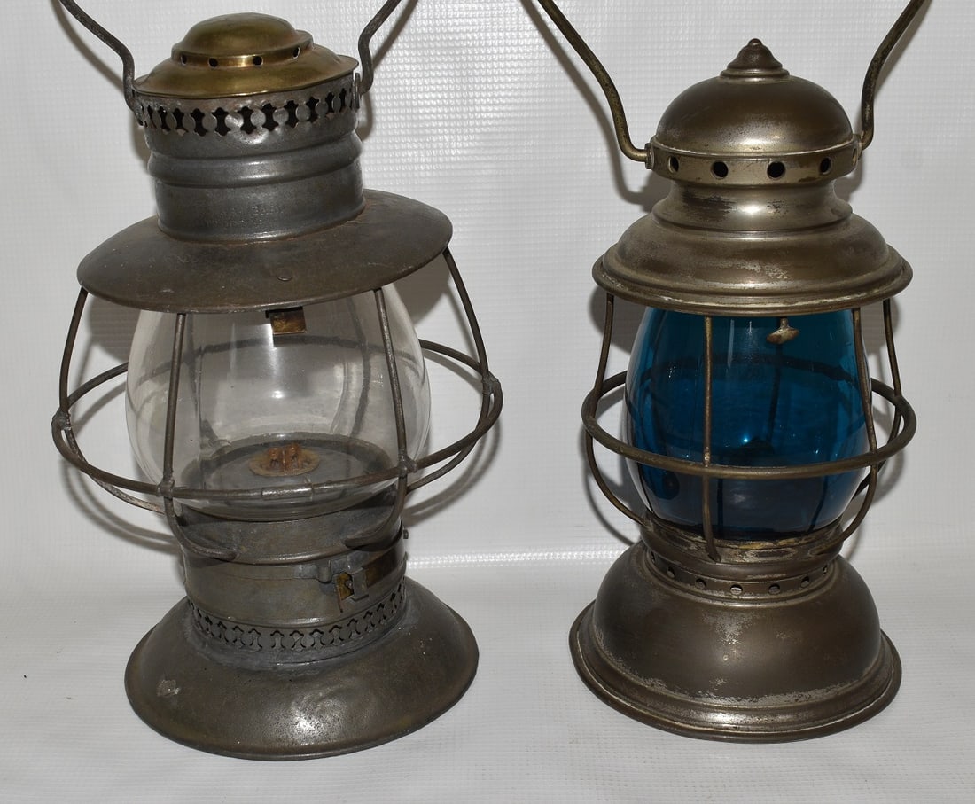 (2) EARLY PRESENTATION RAILROAD LANTERNS,1 W/TEAL GLOBE