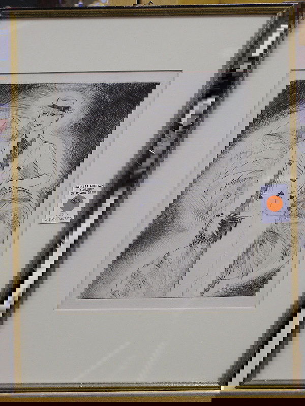 Sold(2) ETCHINGS, STEPHEN LORBER & RON ROBLES, SIGNED(lot of 2) Framed etchings: (1) "Navajo Ceremonial", by Stephen Lorber (American, b. 1943), pencil signed, dated 1980 and numbered 53/80 lower right, plate: 11.5"h, 15.75"w, overall: 24"h, 32"w; (1) eSee Sold Price