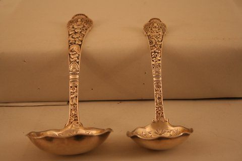 Sold2 Gorham Sterling Sauce / Gravy Ladles King GeorgeA pair of American sterling silver sauce / gravy ladles by Gorham in the King George pattern. Gold wash bowls, each measuring 7" long. The front of handles monogrammed Weiter (surname). Overall weightSee Sold Price