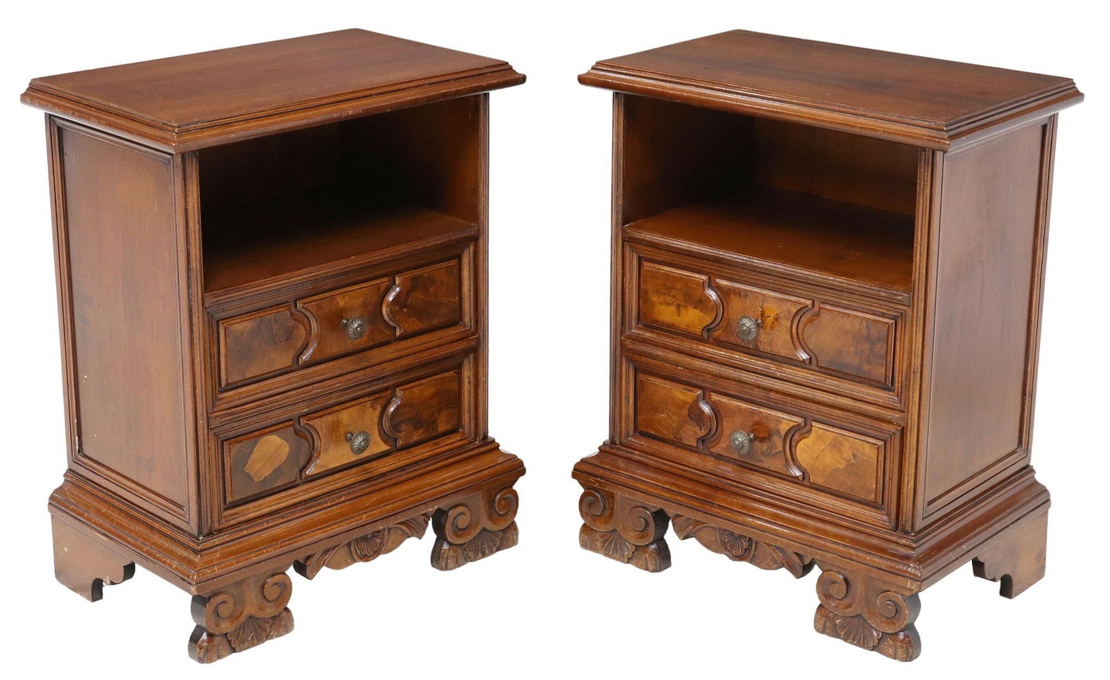 (2) ITALIAN BAROQUE STYLE WALNUT BEDSIDE CABINETS