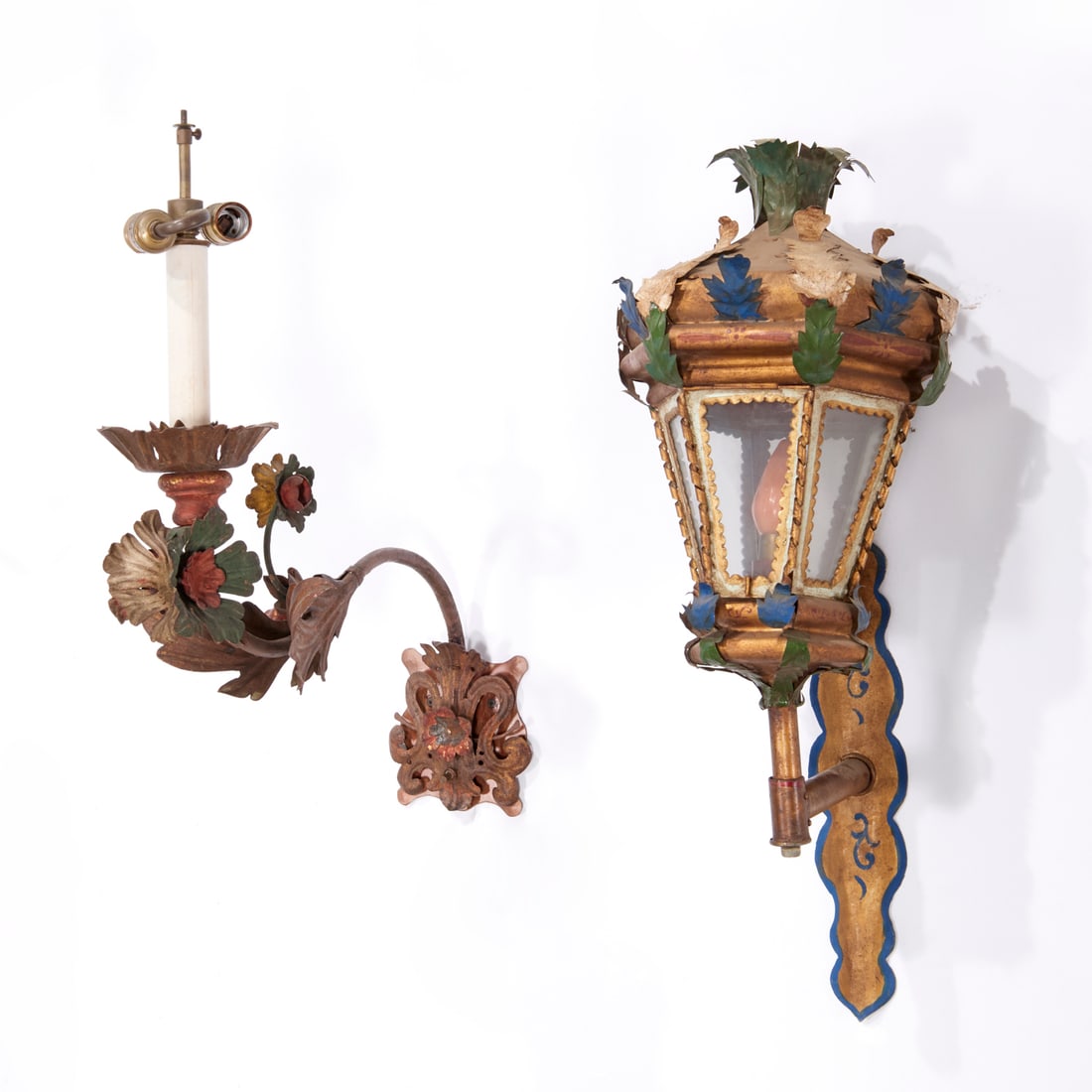 (2) Italian polychrome decorated tole sconces