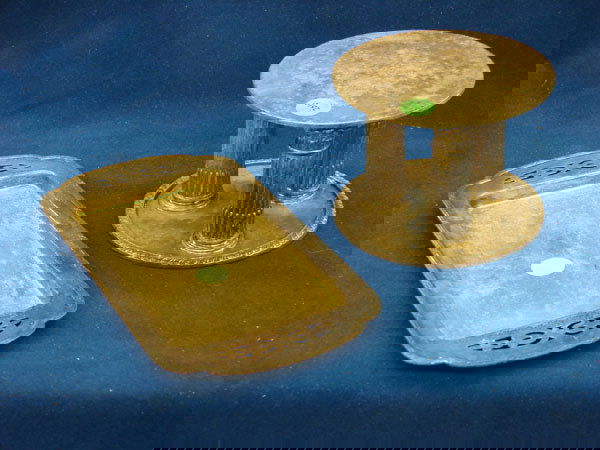 2 items: Metal serving plate, Metal stand w/sculp