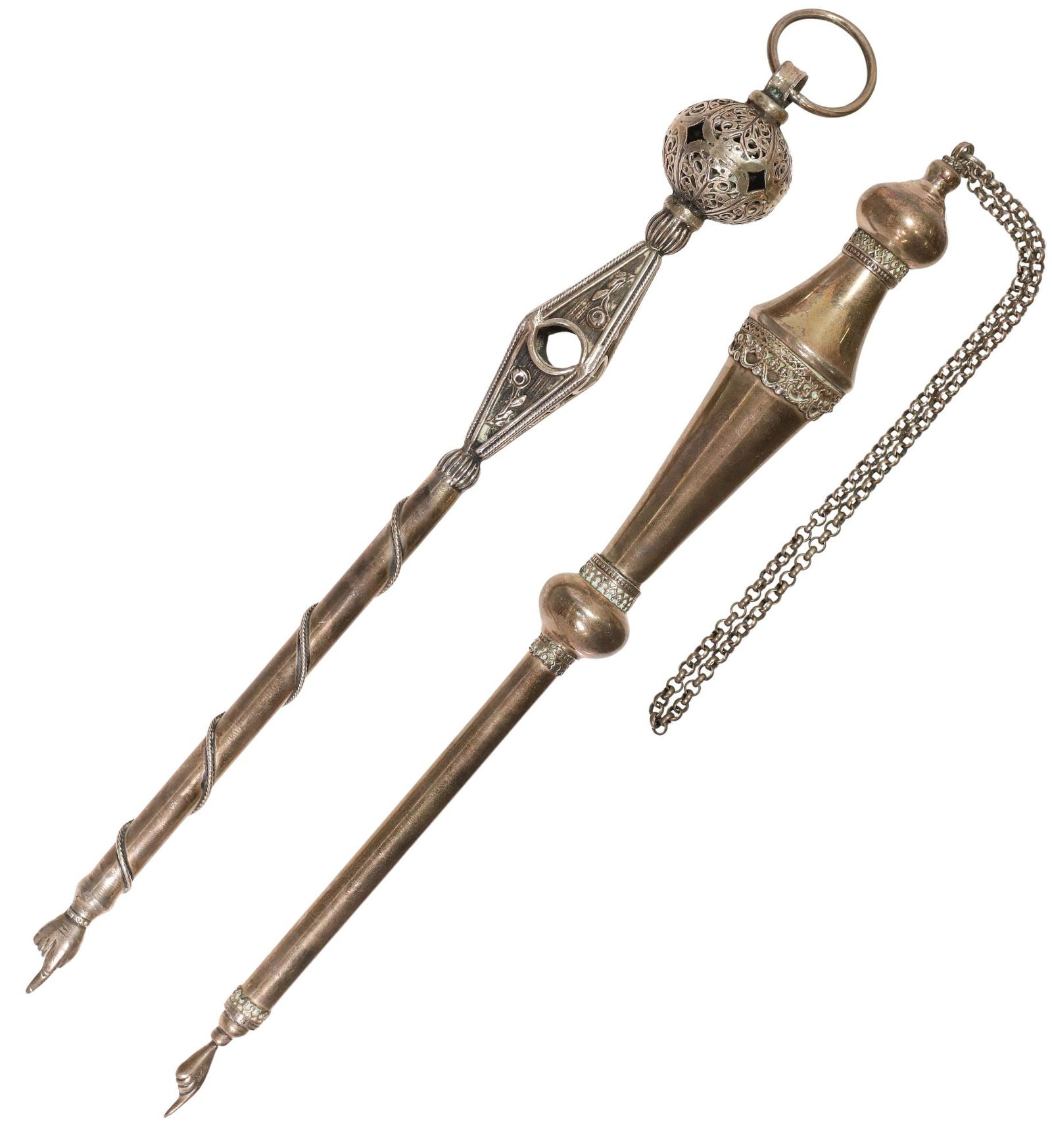 Sold2 Judaica Sterling Silver Items Inc Torah Pointer2 Judaica Sterling Silver Items Including a Torah Pointer and a Very Unusual Mezuzah. Fully Hallmarked Condition: Generally Very Good Dimensions: Torah pointer H- 11", Torah Pointer Chain- 23", TotalSee Sold Price