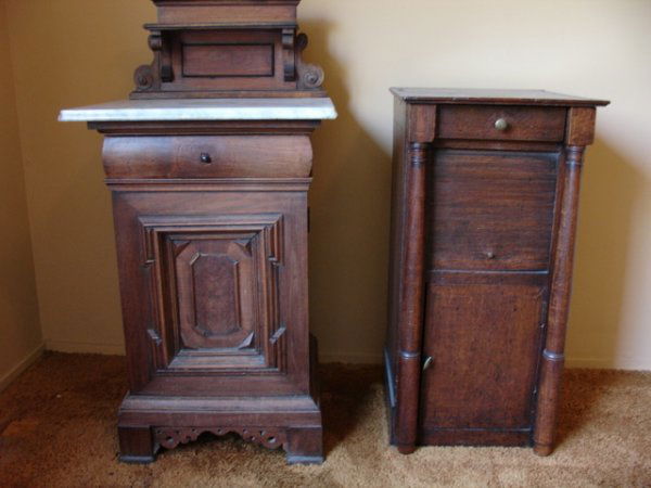 2 L-19TH C BEDSIDE TABLES, 1 W/MARBLE TOP