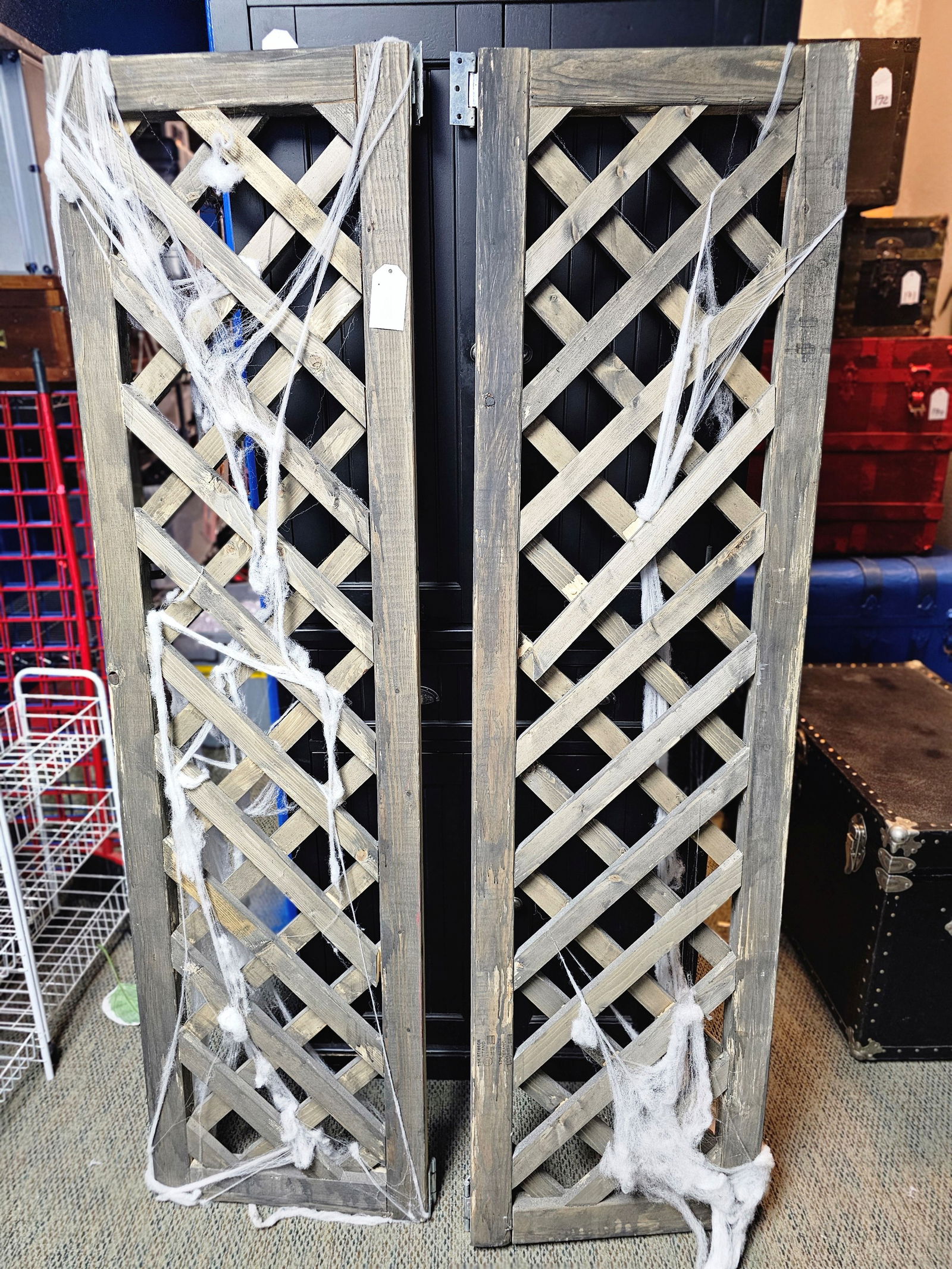SoldTri Fold Vintage Lattice Work Wooden ScreenTri Fold Vintage Lattice Work Wooden Screen / Room Divider. Architectural salvage items. Measures 71.5 inches in height, each panel is 17 inches in width.See Sold Price
