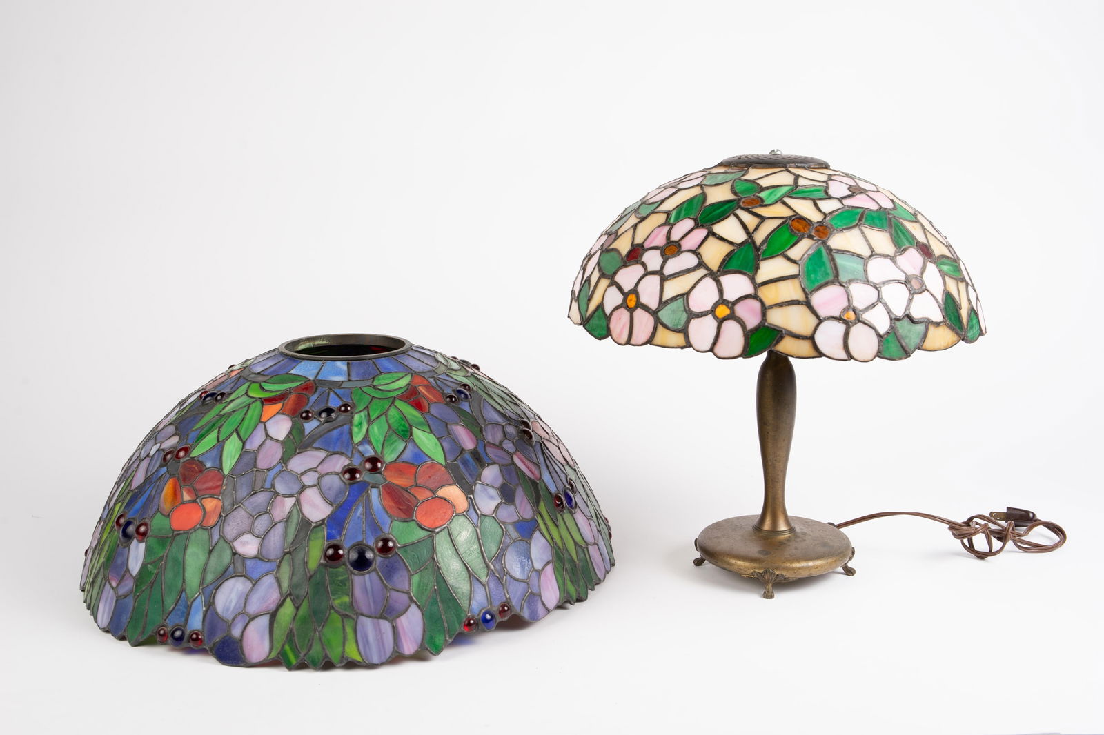 SoldLeaded Stained Glass LampsLeaded Stained Glass Lamps (2) items having unmarked painted metal bases with floral motif shades including a single socket having a deep shaped-edge shade and a 2-socket having a spider supported hemSee Sold Price