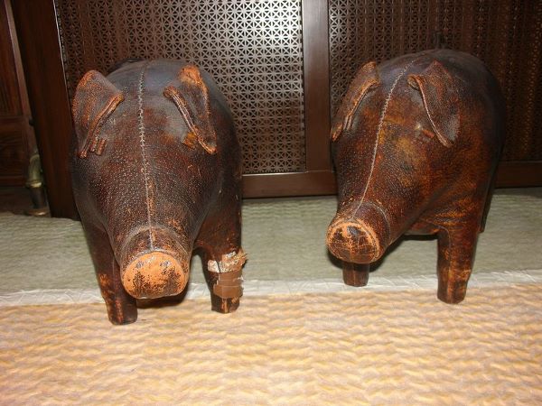 2 LEATHER PIGS , 1 W/LEG DMG.;