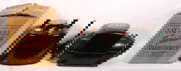 SoldLionel partial train set and accessories,#2360 engine, 2 box cars, machinery car, caboose, ZW transformer, building, platform, track and Ives No. 204 transformer, some lossesSee Sold Price
