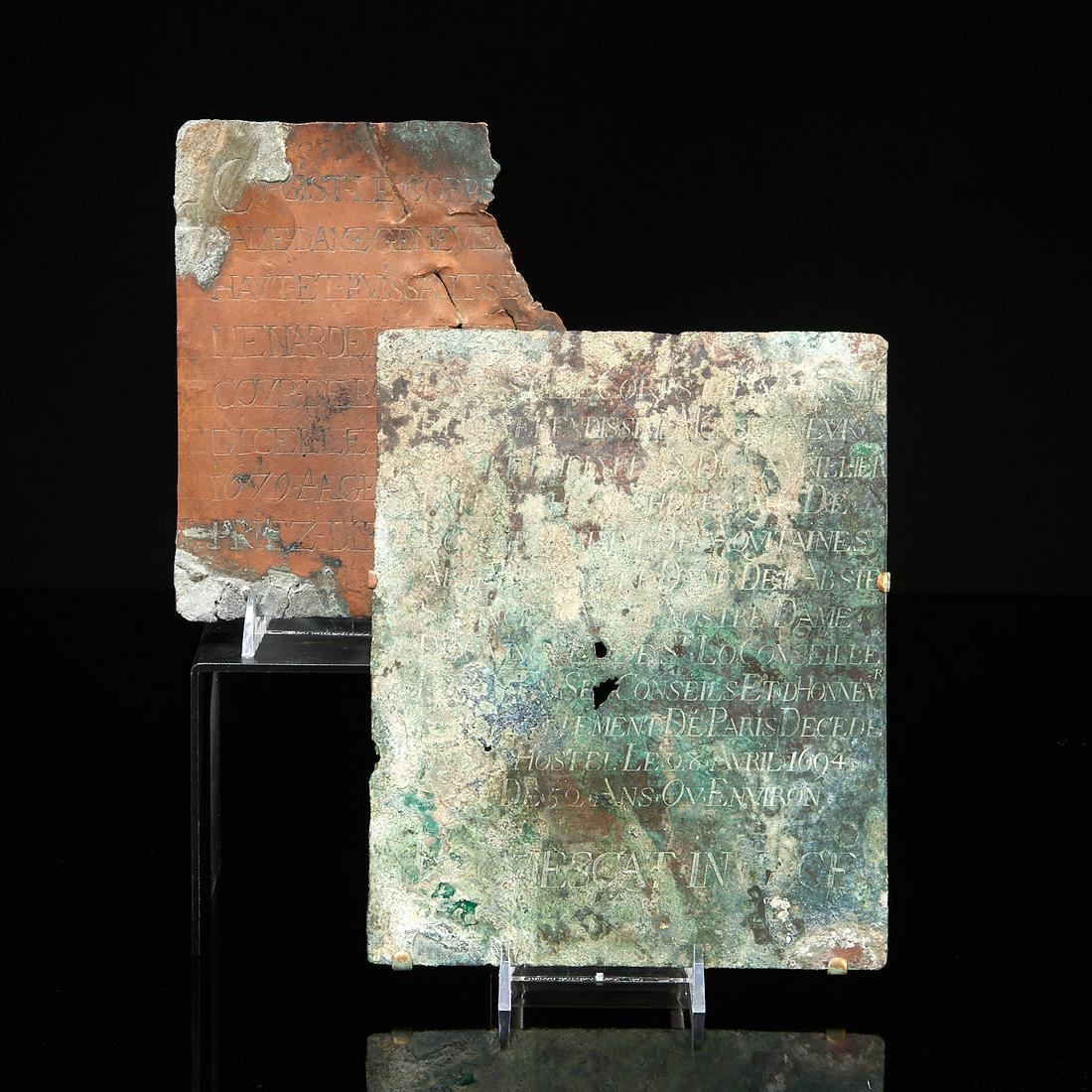 (2) Louis XIV copper funerary plaques