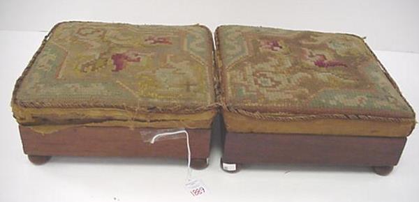 2 Mahogany Framed Square Needlepoint Foot Stools