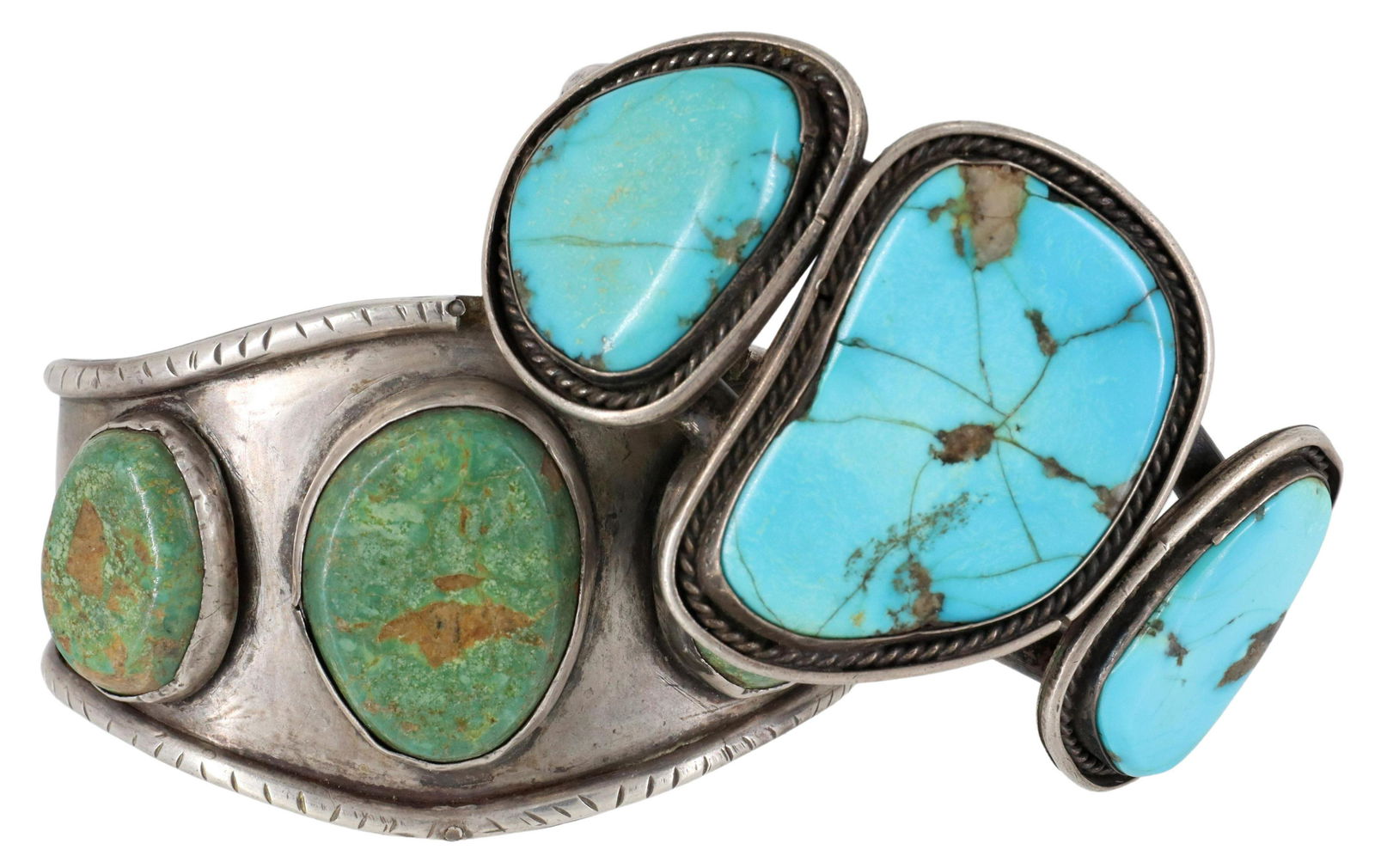 SoldNavajo Silver & Turquoise Cuff Bracelet, 2 7/8" High.Navajo Silver & Turquoise Cuff Bracelet, 2 7/8" High.See Sold Price