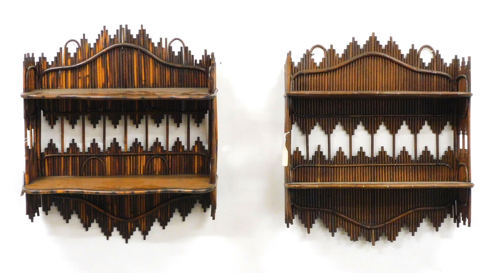 PAIR OF FAUX BAMBOO AND CANED ETAGERE SHELVES