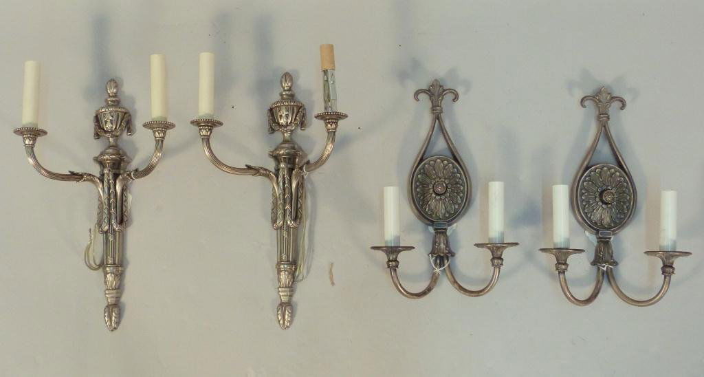 2 Pair Silvered Metal Two Light Sconces
