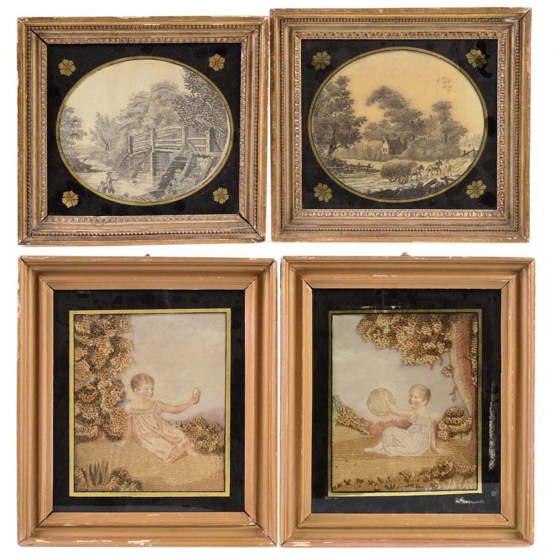 (2) pairs Regency tinted silk needlework pictures