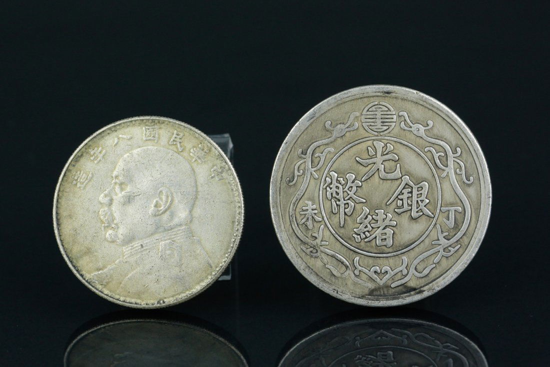 Sold4 PC Chinese Silver CoinsFour pieces of Chinese silver coins; two pieces of Chinese Republic One Yuan coins marked Republic 3rd year and 38th year; two Guanxu Yuanbao silver coins; Thickness: 0.2 cm, D: 4 cm, 27 grams (each)See Sold Price