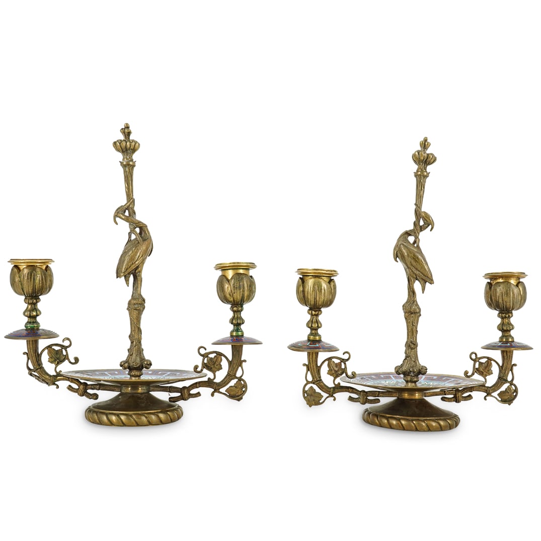 (2 Pc) Chinoiserie Champleve Heron Candelabras