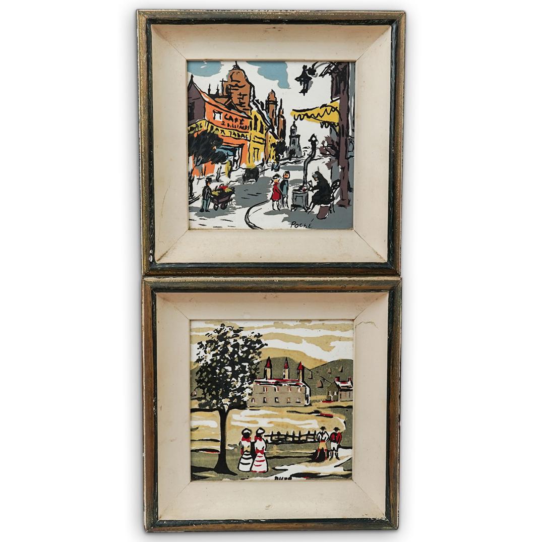 (2 Pc) French Painted Tile Framed Plaques