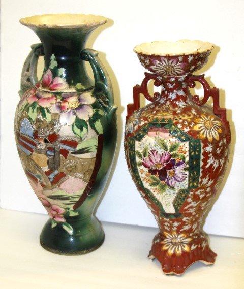 (2 Pc) Antique Japanese Satsuma Porcelain VasesDESCRIPTION: Two antique Meiji period Japanese satsuma porcelain vases, one satsuma vase with raised high relief designs of Japanese figures and foliage throughout with multicolored polychrome finishSee Sold Price