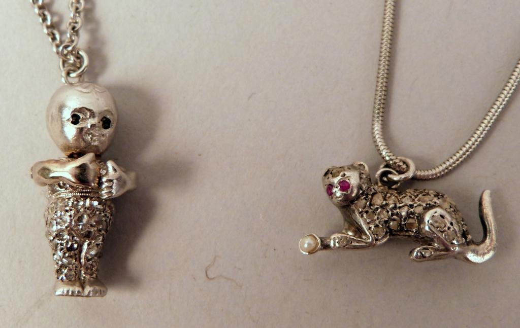 2 Platinum Necklaces with Interesting Charms