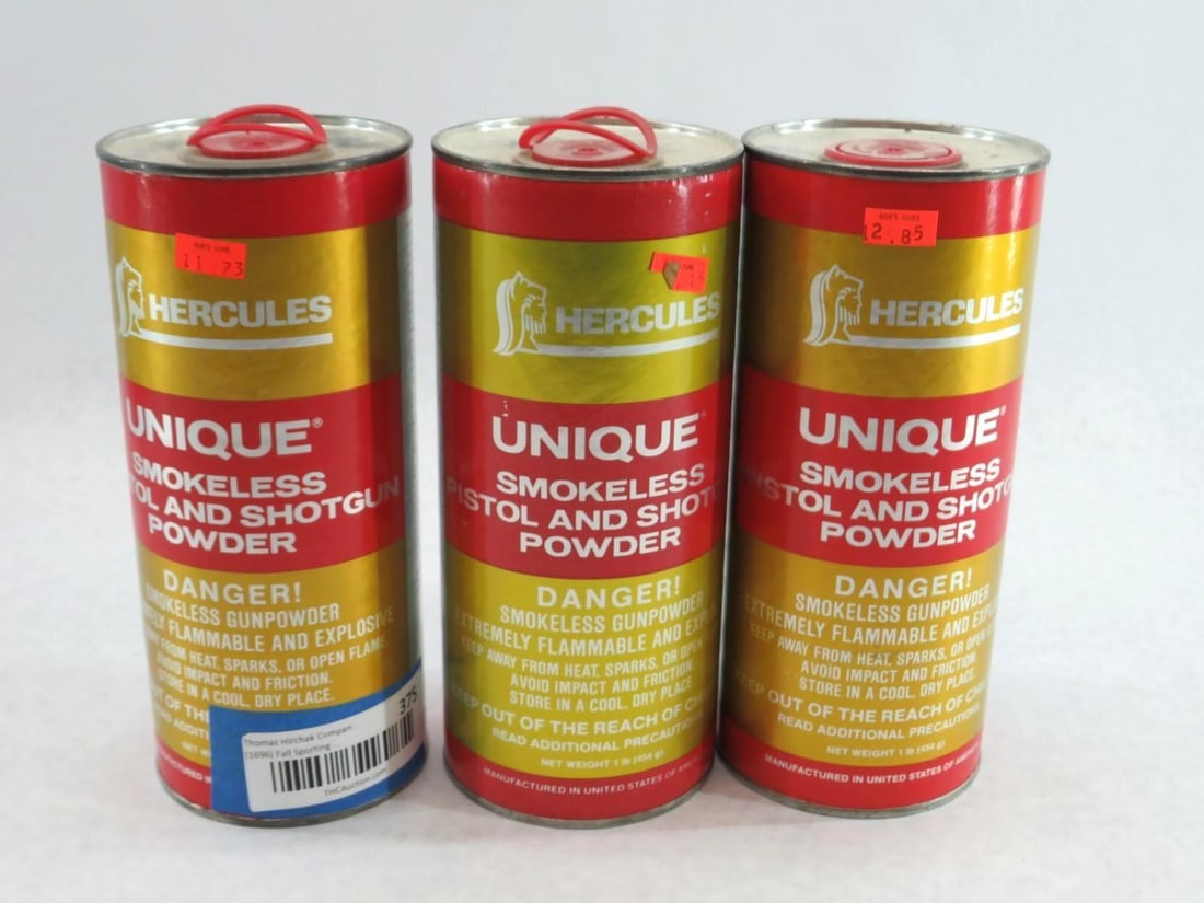 Vintage Smokeless Propellant Powder Tins Lot of Three Winchester Hercules Du Pont4 days LeftAlliant Powder Bullseye Smokeless Pistol Powder Canisters, 1 LB (Lot of 2), Contemporary Production4 days LeftCollection of Four Vintage Smokeless Gunpowder Tins, Hercules, DuPont, and Hodgdon, circa5 days LeftAlliant Powder Bullseye Smokeless Pistol Powder, Two 1 LB Containers, Modern Production5 days LeftPrimrose Speedoil Upper Cylinder Lubricant CansMar 21, 2026Alliant Powder Bullseye Smokeless Pistol Powder, 1 lb. Container, Circa 2000-20204 days Left3 Antique Powder Tins w Schaghticoke Powder CoMar 07, 2026Hercules UNIQUE Smokeless Pistol and Shotgun Powder 4 lb Canister, Mid-20th Century5 days Left7.25lbs. Assorted Smokeless Powder2.5lbs. +/- IMR 4350 Powder5lbs. +/- IMR 4198 Powder9lbs. +/- Assorted Gun Powder5lbs. +/- IMR 4064 Powder2lbs. Hercules Shotgun Shell Powder & 12 Ga. & .410 Bore Wads4lbs. +/- Alliant Unique Powder(2) GUNPOWDER TINS, PAPER LABELSFeb 26, 2026