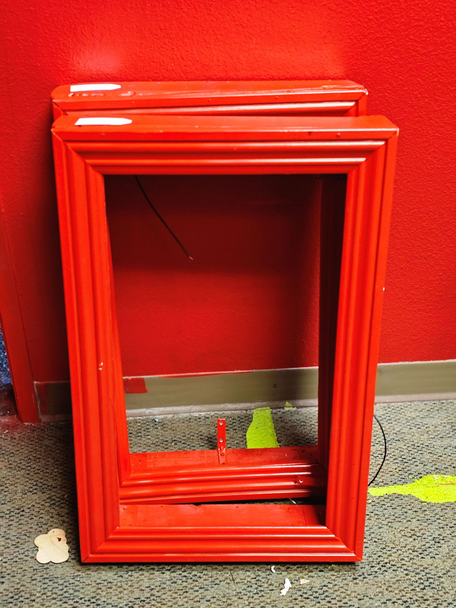 Sold(2) MODERN PYRAMIDAL STANDING MIRRORS, 79"H(lot of 2) Modern pyramidal standing mirrors, c.1970s-1980s, in varied sizes, having red frames, encasing paneled mirror panels to each side, some small losses, largest: approx 79"h, 23.75"w, 4.25"d SSee Sold Price