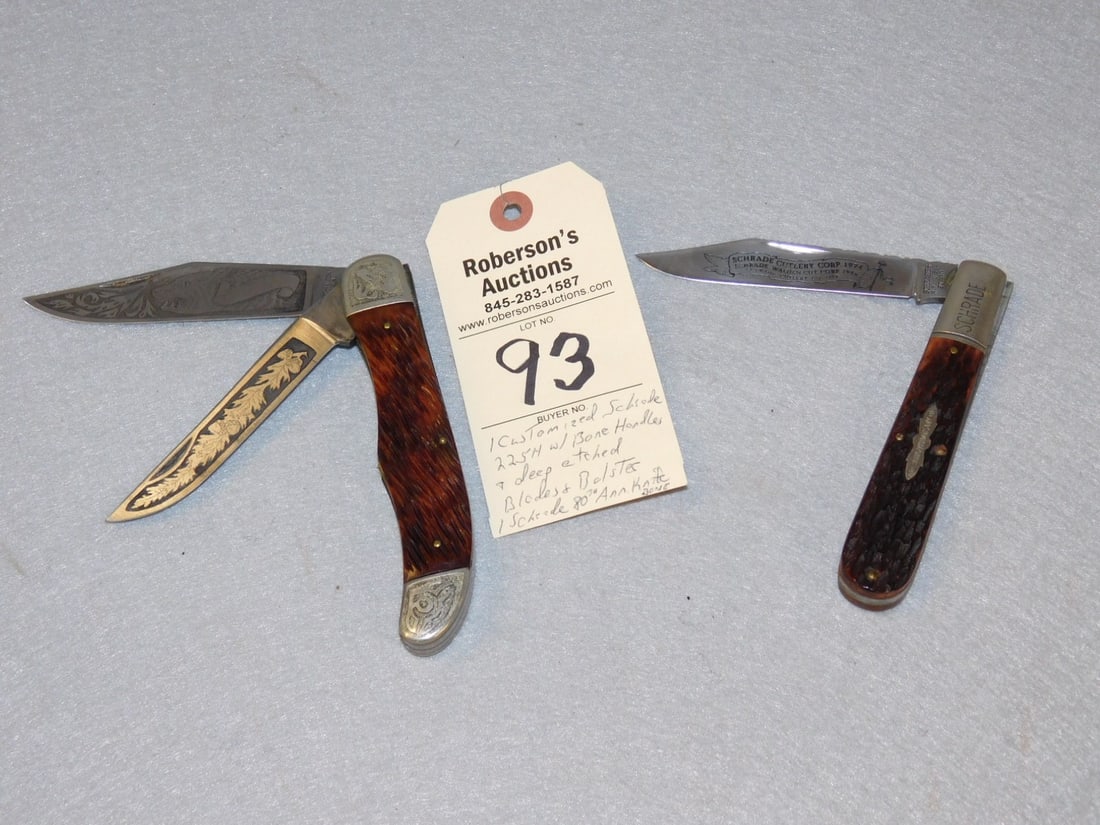 LOT 4 KNIVES WITH DECORATIVE HANDLESMar 05, 2026LOT OF 5: SCHRADE POCKET KNIVES.6 days LeftLOT OF 3: C.1970S-90S HUBERTUS KNIVES.6 days LeftLOT OF 3: SCHRADE DOUBLE BLADE SWITCHBLADES.6 days LeftLOT OF 2: SCHRADE M2 PARATROOPER SWITCHBLADE KNIVES.6 days LeftLOT OF 4: PRESTO AND SCHRADE FISHTAIL SWITCHBLADE KNIVES.6 days LeftLOT OF 3: STAINLESS CUTLERY, RICHARD’S & CONOVER, WESTERN, POCKET KNIVES.6 days LeftLOT OF 3: C.1940S-50S SCHRADE TRAPPER, STOCKMAN, AND SENATOR.6 days LeftLOT OF 5: SCHRADE AND SCHRADE CUT CO. POCKET KNIVES.6 days LeftLOT OF 3: KA-BAR AND UNION CUT CO. POCKET KNIVES.6 days LeftVintage Ontario Old Hickory and Regent Carbon Steel Butcher Knives Lot of 3`Mar 16, 2026LOT OF 3: KEEN KUTTER ETCHED WHITTLER, LOBSTER, AND SENATOR POCKET KNIVES6 days LeftLOT OF 2: EARLY GERMAN MADE WILD BOAR FOLDING BLADE HUNTING KNIVES STAG HANDLES.6 days LeftLOT OF 3: SCHRADE CUT CO. AND SCHRADE WALDEN NY DOUBLE BLADE SWITCHBLADES.6 days LeftLOT OF 2: SCHRADE CUT CO. CIGAR AND CATTARAUGUS FOUR BLADE SCOUT KNIFE.6 days LeftLOT OF 4: POCKET KNIVES INCLUDING HEDENGRAN & SON, BANNER FOLDING GUARD, AND SCHRADE CUT CO. DOUBLE6 days Left