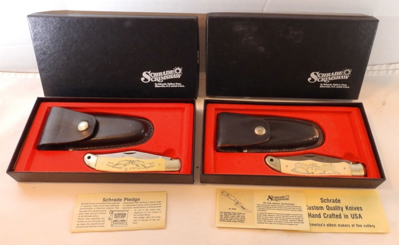 2 Schrade Scrimshaw Knives, Leather Sheaths