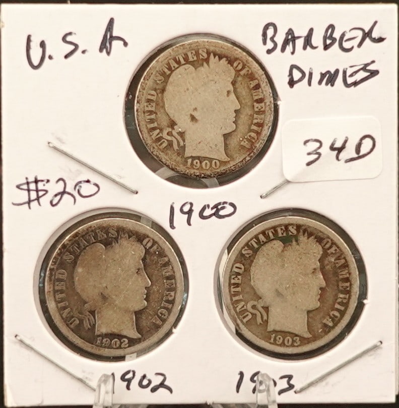 Various Dates Silver Coins LotMar 15, 2026Lot of 2 Silver Barber Dimes- 1913, 1914Lot of 4 Silver Barber Dimes- 1914-1916Lot of 2 Silver Barber Quarters- 1911, 1912Lot of 3 Silver Barber Dimes- 1913, 1914, 1916Lot of 2 Silver Barber Dimes- Both 1914-DLot of 2 Silver Barber Dimes- Both 1914-DLot of 2 Silver Barber Quarters- 1902-S, 1903-SLot of 3 Liberty V Nickels- 1905, 1910, 1912-DLot of 3 Silver Barber Dimes-1898, 1903-O, 1905-OLot of 3 Silver Barber Quarters- 1907-D, 1908-D, 1909-DSix fun, mixed, silver dimesNine Barber Silver Quarters - (2) 1892, 1894, 1895, 1898, 1899, 1909, 1911, 1914 - 49 GramsMar 12, 2026Five mixed Silver Dimes8 US mercury dimes: 2 1918, 1942, 1936, 1939, 2 1944, 1917Mar 08, 2026[2 Coins] 1901-1926 50C Comm. Coin & Morgan $112 hrs Left