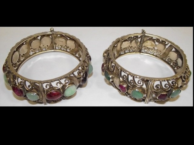 2 Silver Bracelets w/Tourmalines, Jade, Garnets