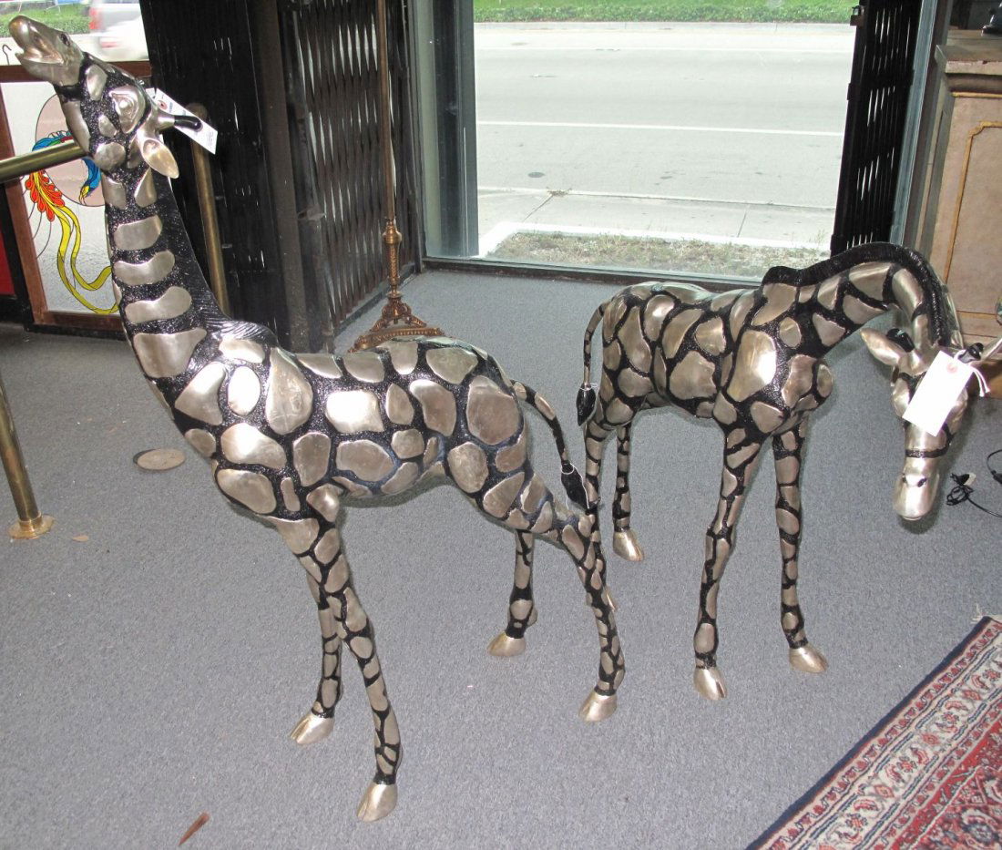 2 HUGE SILVER PATINA BRONZE GIRAFFE SCULPTURES, LARGEST2 HUGE SILVER PATINA BRONZE GIRAFFE SCULPTURES, LARGEST 51"H X 30"W, SMALLER IS 36"H X 41"WSee Sold Price