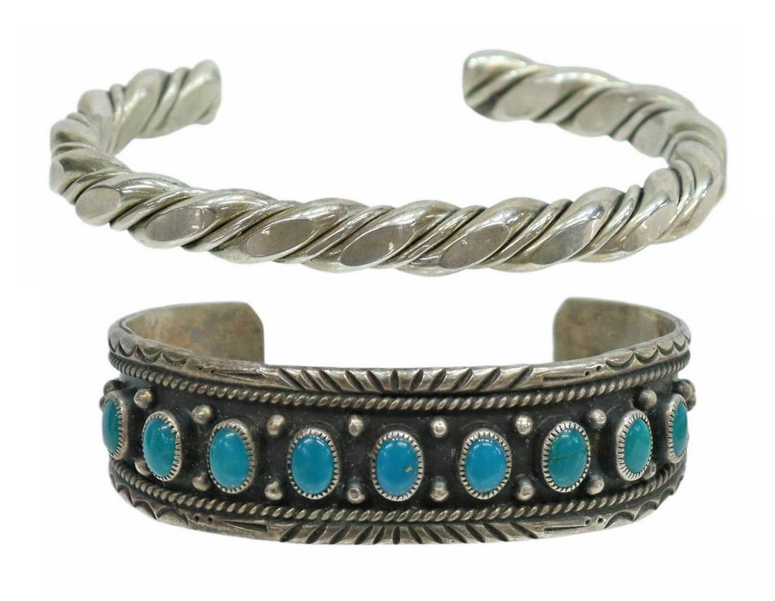 SoldJEWELRY: Five pieces of Native American / Southwest style jewelry, including three silver cuffJEWELRY: Five pieces of Native American / Southwest style jewelry, including three silver cuff bracelets with turquoise type stone, no artist marks viewed, all cuffs approximately 2 1/2" w.; a silverSee Sold Price