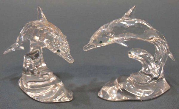 (2) SWAROVSKI CRYSTAL DOLPHIN FIGURES ON WAVE BASE