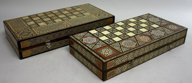 Sold2 Syrian Inlaid Backgammon BoxesOne decorated with busts. Largest approx. 20" W. Property from the estate of Nathan & Janet Appleman, Ocean NJ. Some losses.See Sold Price