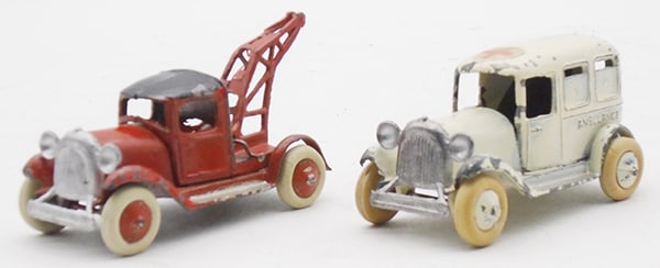 Sold2 TAYLOR & BARRETT VEHICLESDie cast, 3 in long, 129 Breakdown Lorry, red & black, missing hook, 117 Ambulance, cream, both have worn rubber tires, C5-6.See Sold Price