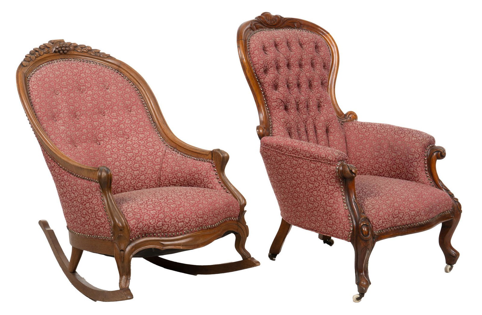 Sold(2) VICTORIAN UPHOLSTERED HIS & HERS CHAIRS(lot of 2) Victorian style ladies and gents chairs, foliate carved mahogany frames, mauve buttoned back upholstery, raised on scroll foot cabriole legs: (1) gents chair with padded arms, 40"h, 29"w, 2See Sold Price