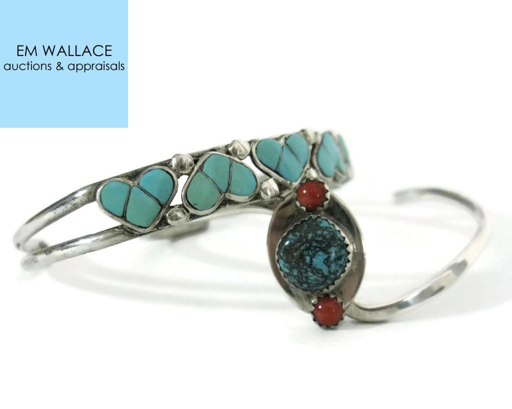 SoldJewelry. (2) Vintage Native American turquoise sterling cuff/bracelets, stampwork design on both,Jewelry. (2) Vintage Native American turquoise sterling cuff/bracelets, stampwork design on both, cuff w/ single oval green stone is slightly bentSee Sold Price