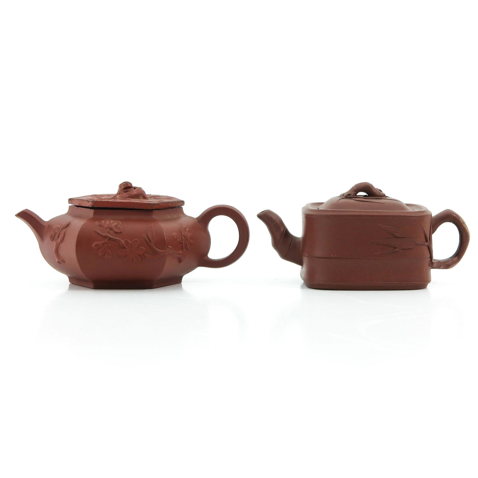 SoldTwo (2) Chinese Yixing Zisha TeapotsTwo (2) Chinese Yixing Zisha Teapots; Size: L: 5-1/2" (biggest)See Sold Price