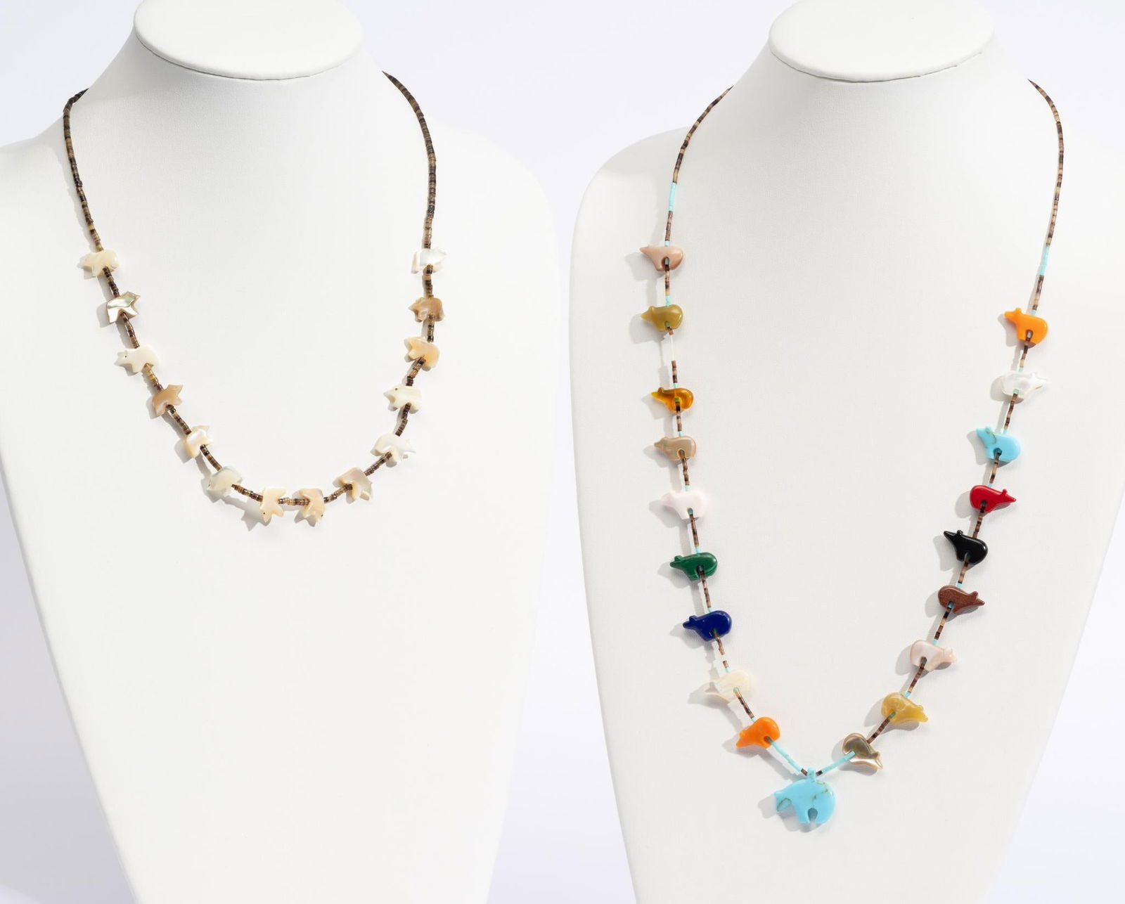 Sold(2 Pc) Native American Zuni Multi Stone Fetish NecklacesDESCRIPTION: (2 Pc) A Pair of Native American Zuni three-strand multi stone fetish necklaces, hand crafted with carved gemstones charm fetishes, designed with animal shapes such as fishes and birds. CSee Sold Price