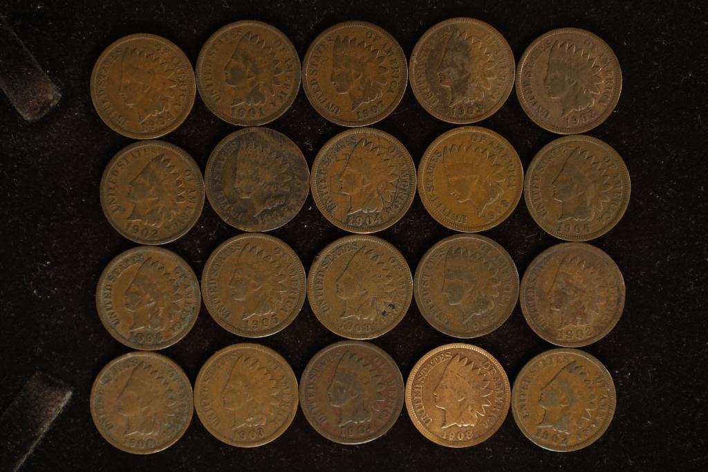 SoldLot of (20) Indian Head Cents with Full LibertyIncludes (2) 1904, (3) 1905, (6) 1906(8) 1907 & 1908.See Sold Price