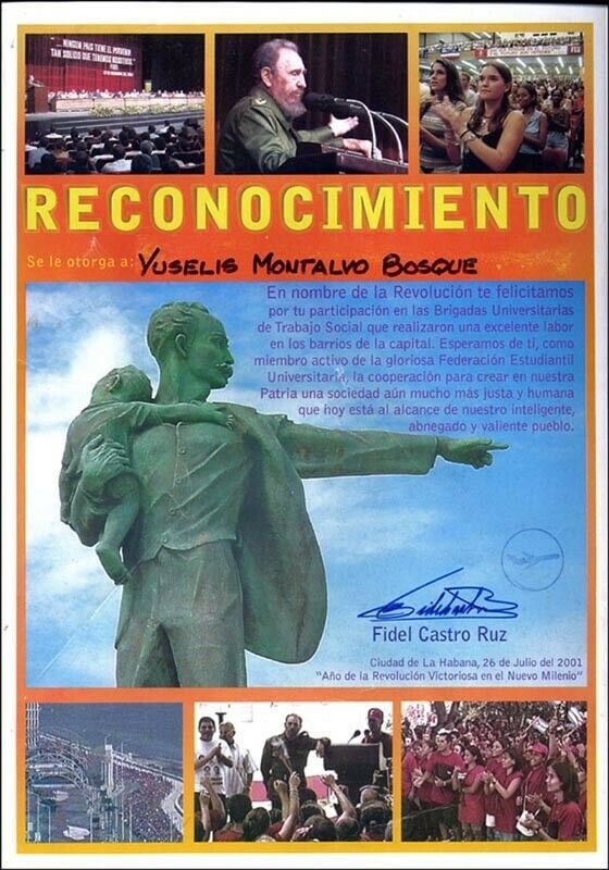 SoldFidel Castro Signed Revolution Recognition AwardRecognition award for Yunaisi Pantoja Caraballo. Signed by Fidel Castro Ruiz. Framed and matted 18x23.See Sold Price
