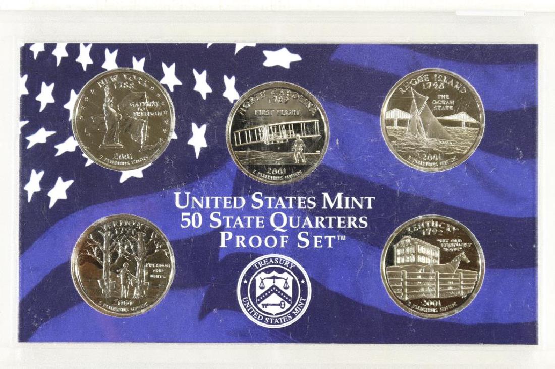 SoldUS MINT 50 STATE QUARTERS PROOF SETS W/ COA'S (8)120190 US MINT 50 STATE QUARTERS PROOF SETS W/ COA'S (8) U.S. Mint 50 state quarters proof sets to include the following: 2001, 2002, 2003(3), and 2004(3). All sets include original boxes and certificSee Sold Price