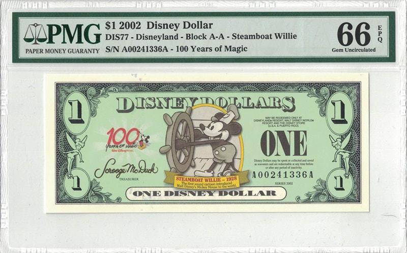 Sold2002 $1.00 (AA) Steamboat Willie (DIS#77) CU-68 EPQ PMG2002 $1.00 (AA) Steamboat Willie (DIS#77) CU-68 EPQ PMG Product ID: 263366 Year: 2002 Grade: (PMG) Superb Gem Unc - 68 Grade Service: PMG Denomination: 1 Dollar Mint Mark: Disneyland MetaSee Sold Price