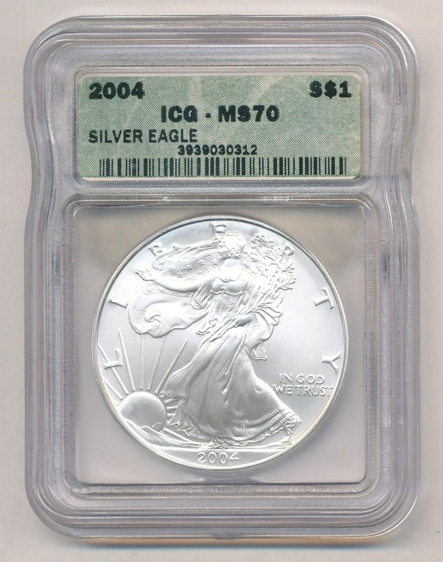 Sold2004 American Silver Eagle ICG MS70Winner shall receive the exact coin shown here. (EM/B)See Sold Price