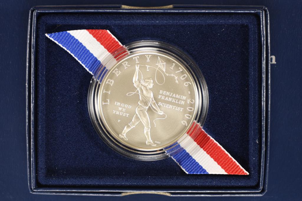 Sold2006 P Benjamin Franklin Silver Dollar Coins Uncirculated and Proof coins Lot of 2Numismatic. UNITED STATES MINT 2006 Benjamin Franklin Commemorative Coin Program "Scientist" Uncirculated Silver Dollar and One PROOF Silver Dollar. Each comes in a presentation box from the US MINT wSee Sold Price